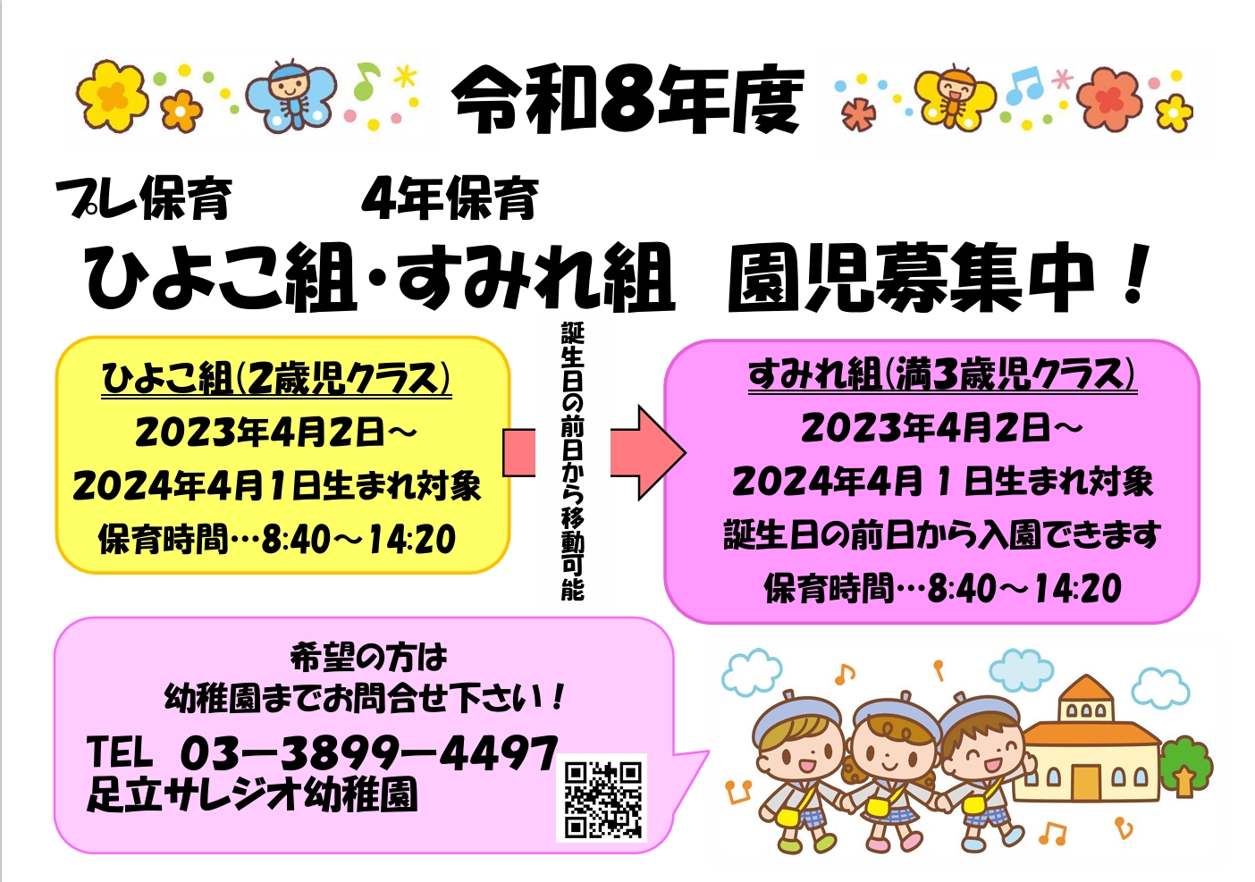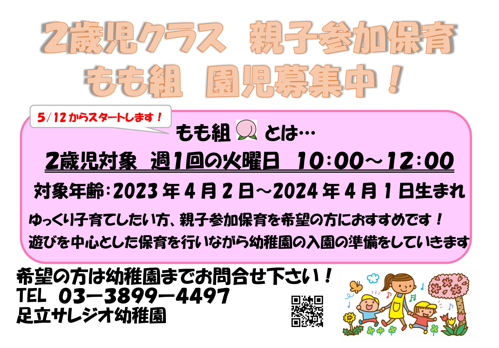 2歳児「もも組」「ひよこ組」 満3歳児「すみれ組」