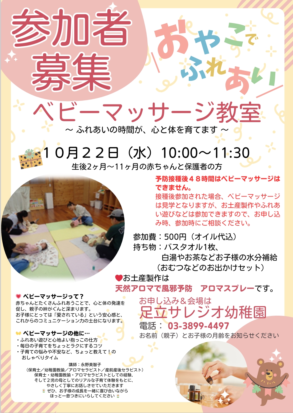 幼稚園では前回もたくさんの方に参加していただいた、ベビーマッサージ教室を開催したいと思います!